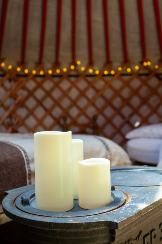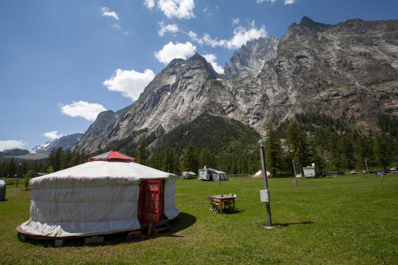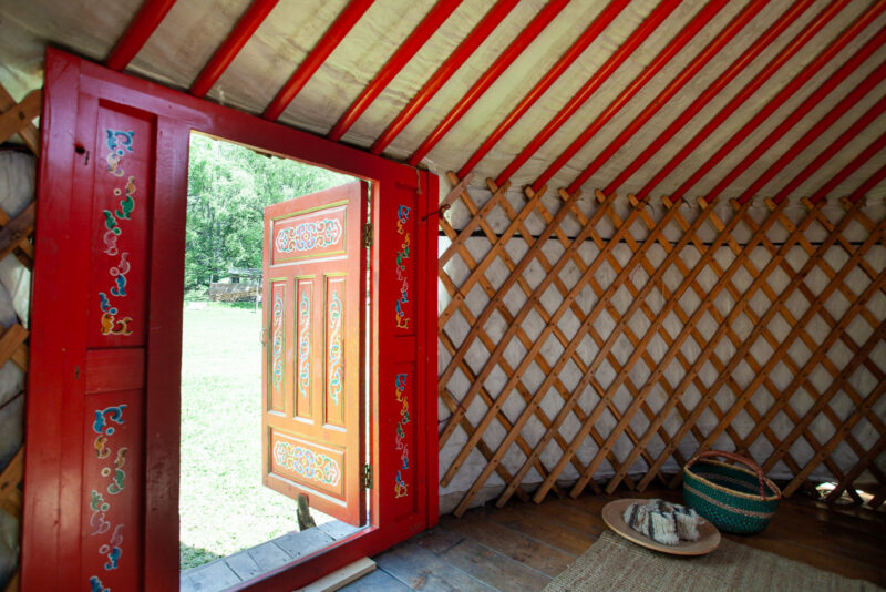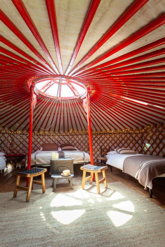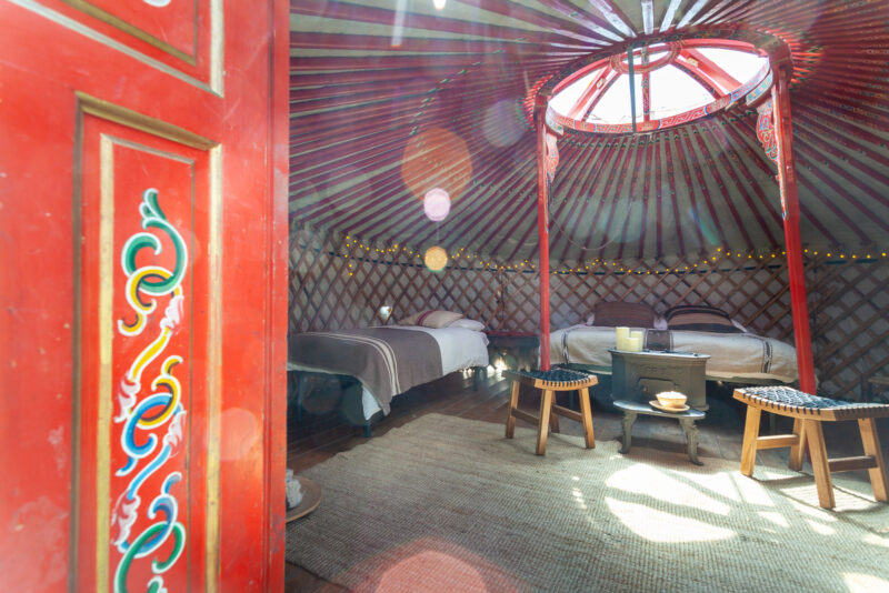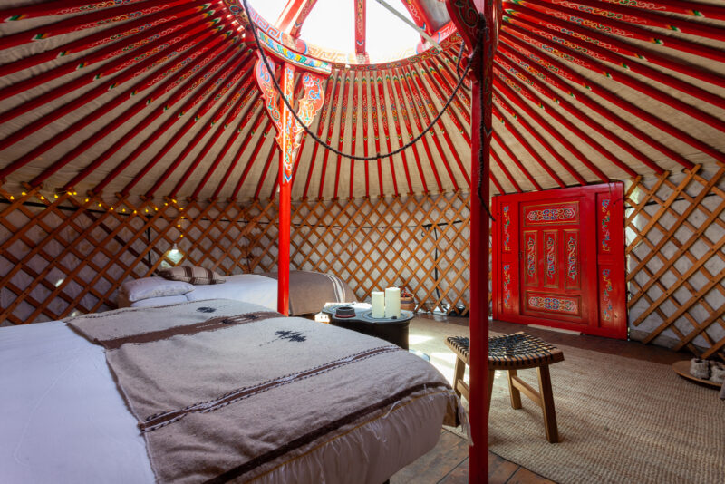 La tenda Yurta è una tenda in canvas bianco della tradizione dei popoli nomadi del deserto del Gobi, di 25 mq, allestita in stile etnico con un letto matrimoniale e due letti singoli, con piumini invernali e biancheria da letto e da bagno per tutti, oltre a una piccola stufa per migliorare il comfort.